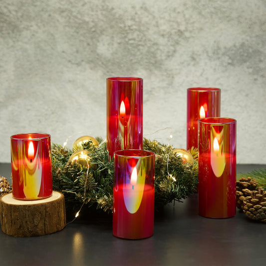 Slim Tall Red Glass Flameless Candles with Remote- Set of 5 -Eywamage