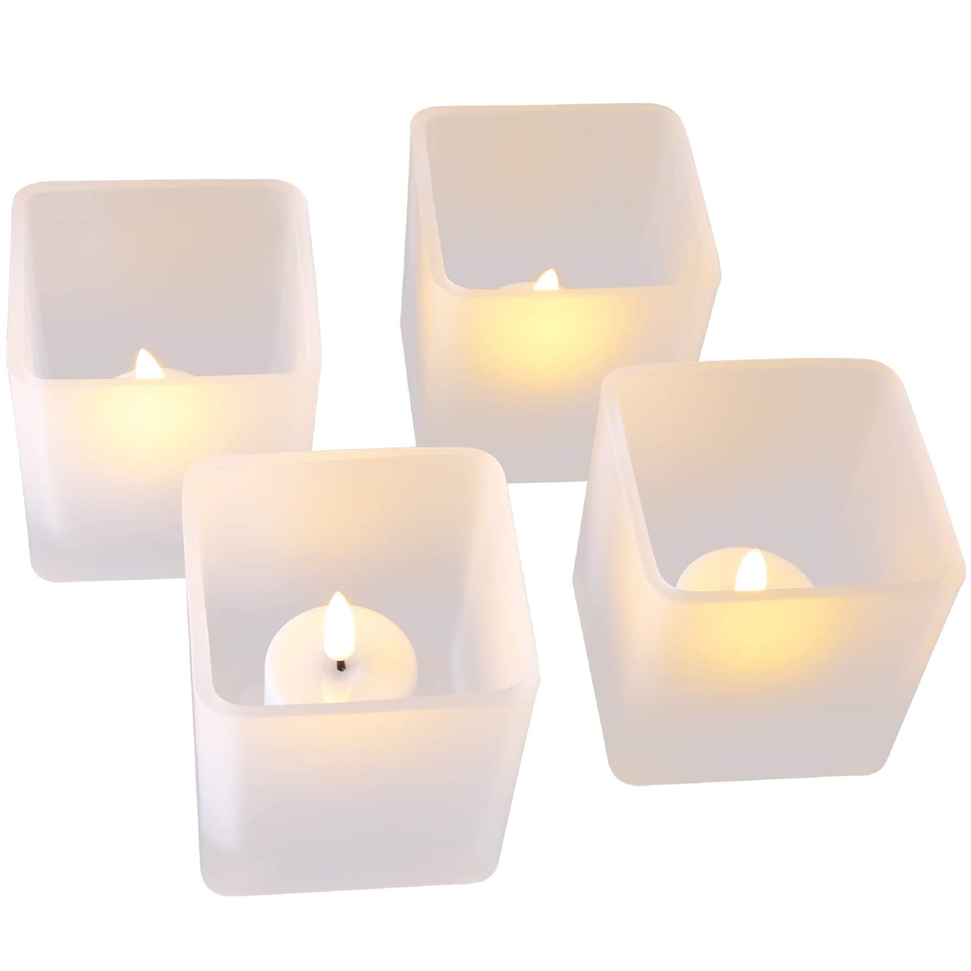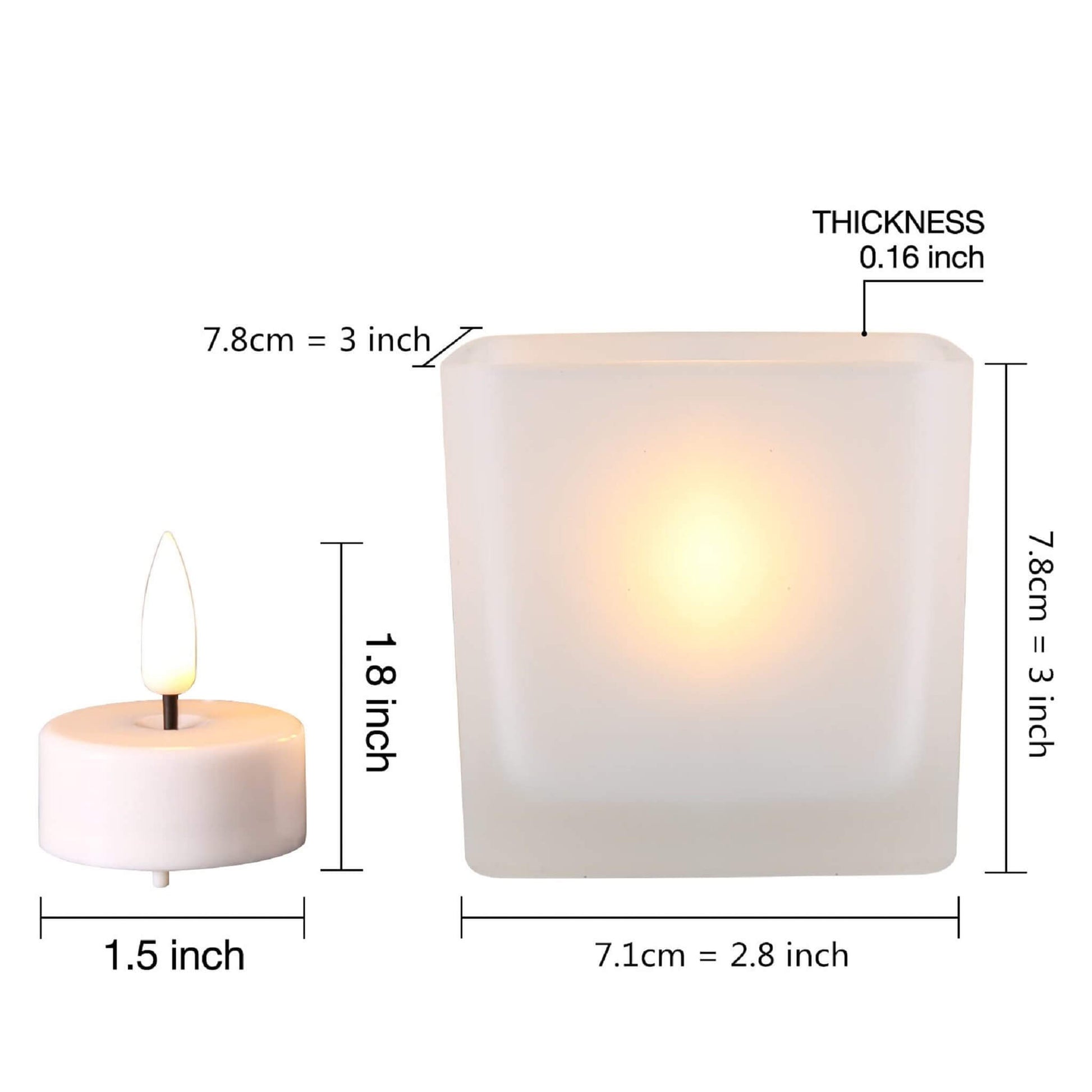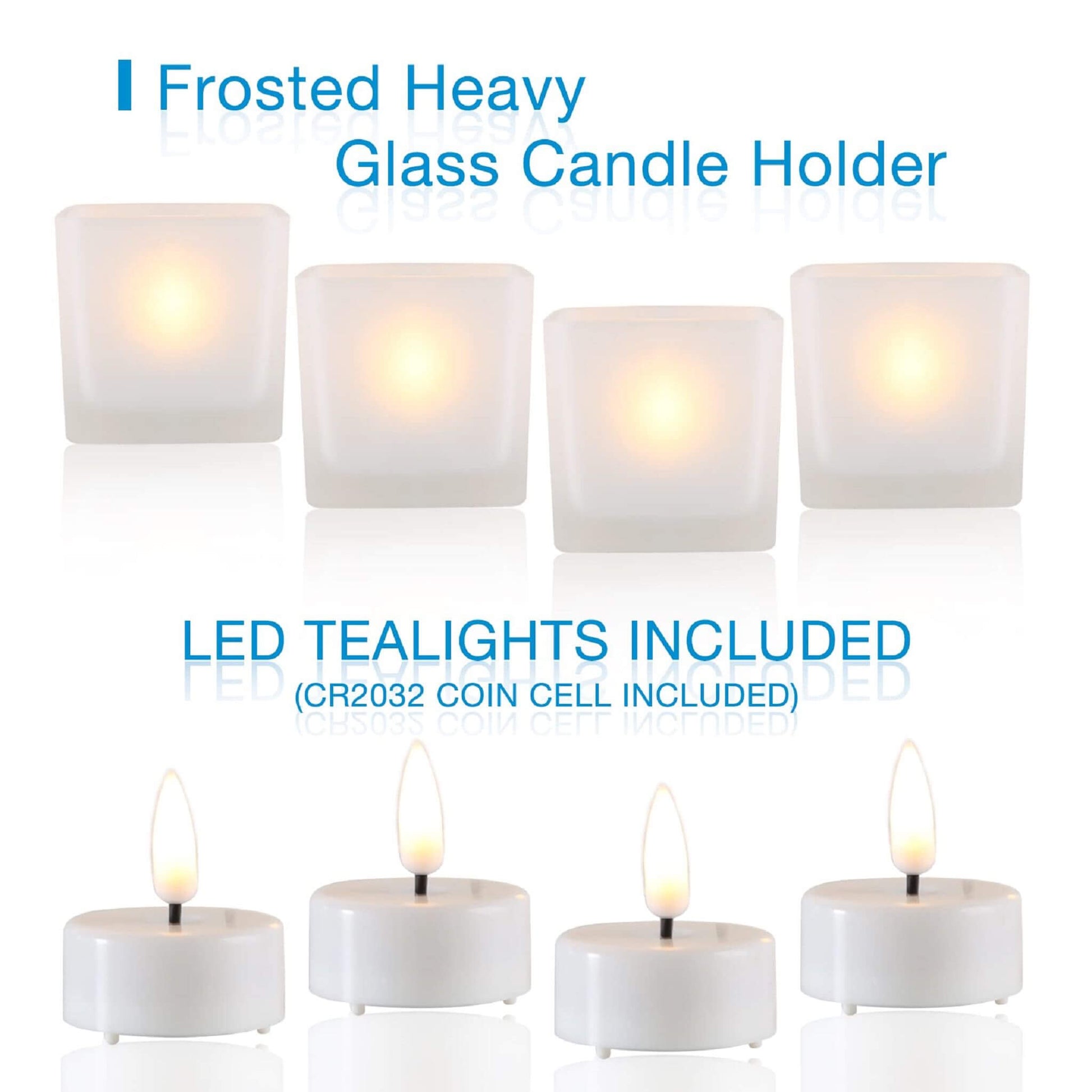 - EL PAQUETE INCLUYE: 4 portavelas cuadrados de vidrio esmerilado, 4 velas de té LED de plástico con temporizador (4 celdas tipo moneda CR2032 INCLUIDAS).