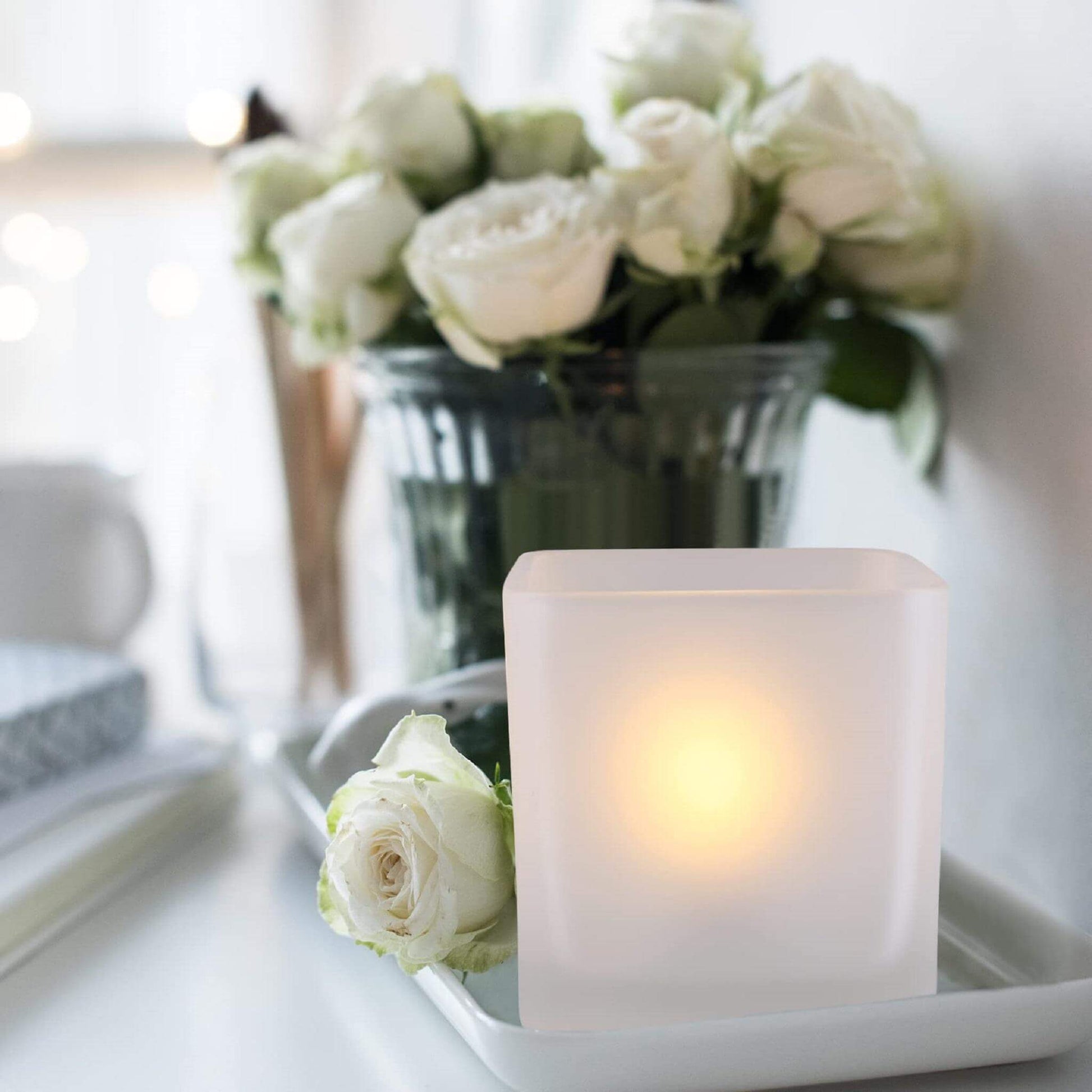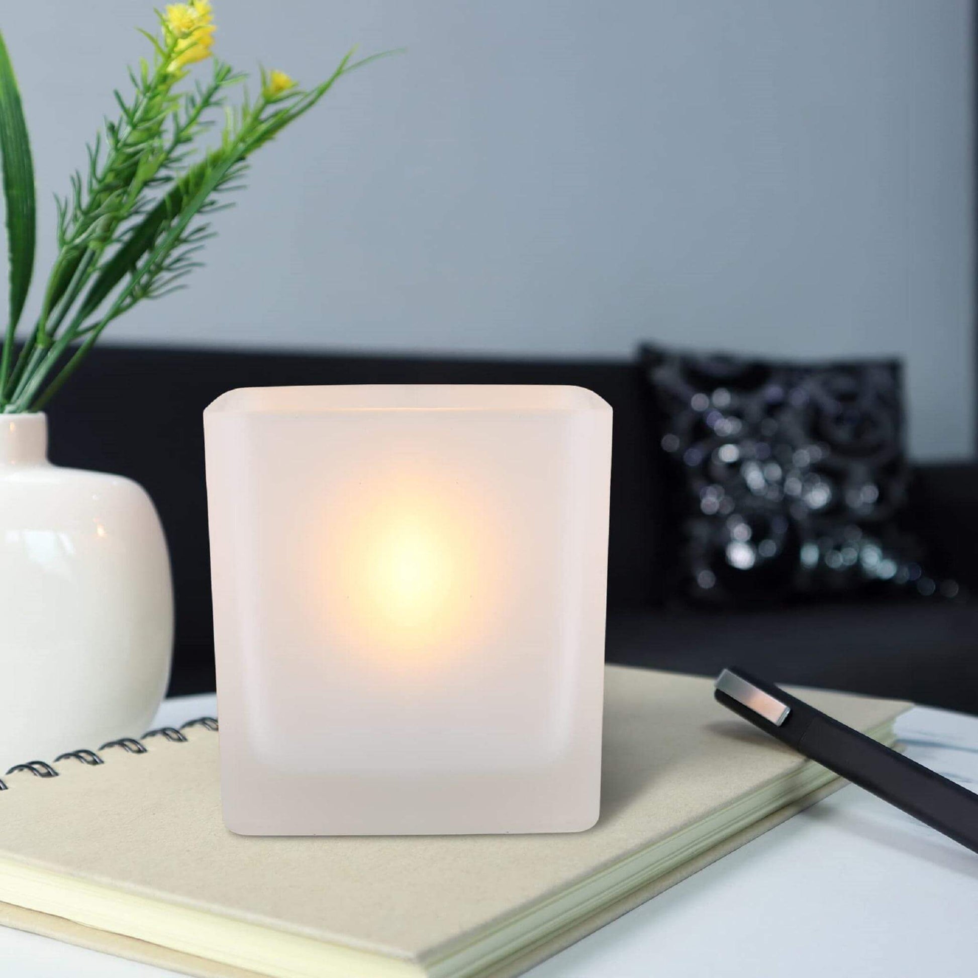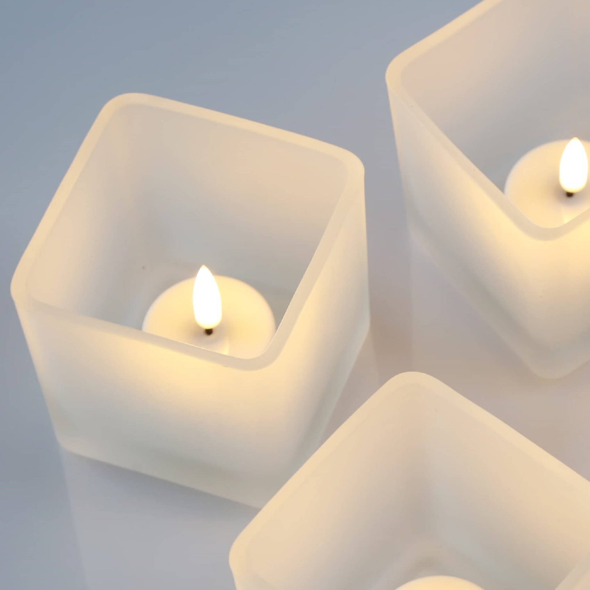 - EL PAQUETE INCLUYE: 4 portavelas cuadrados de vidrio esmerilado, 4 velas de té LED de plástico con temporizador (4 celdas tipo moneda CR2032 INCLUIDAS).