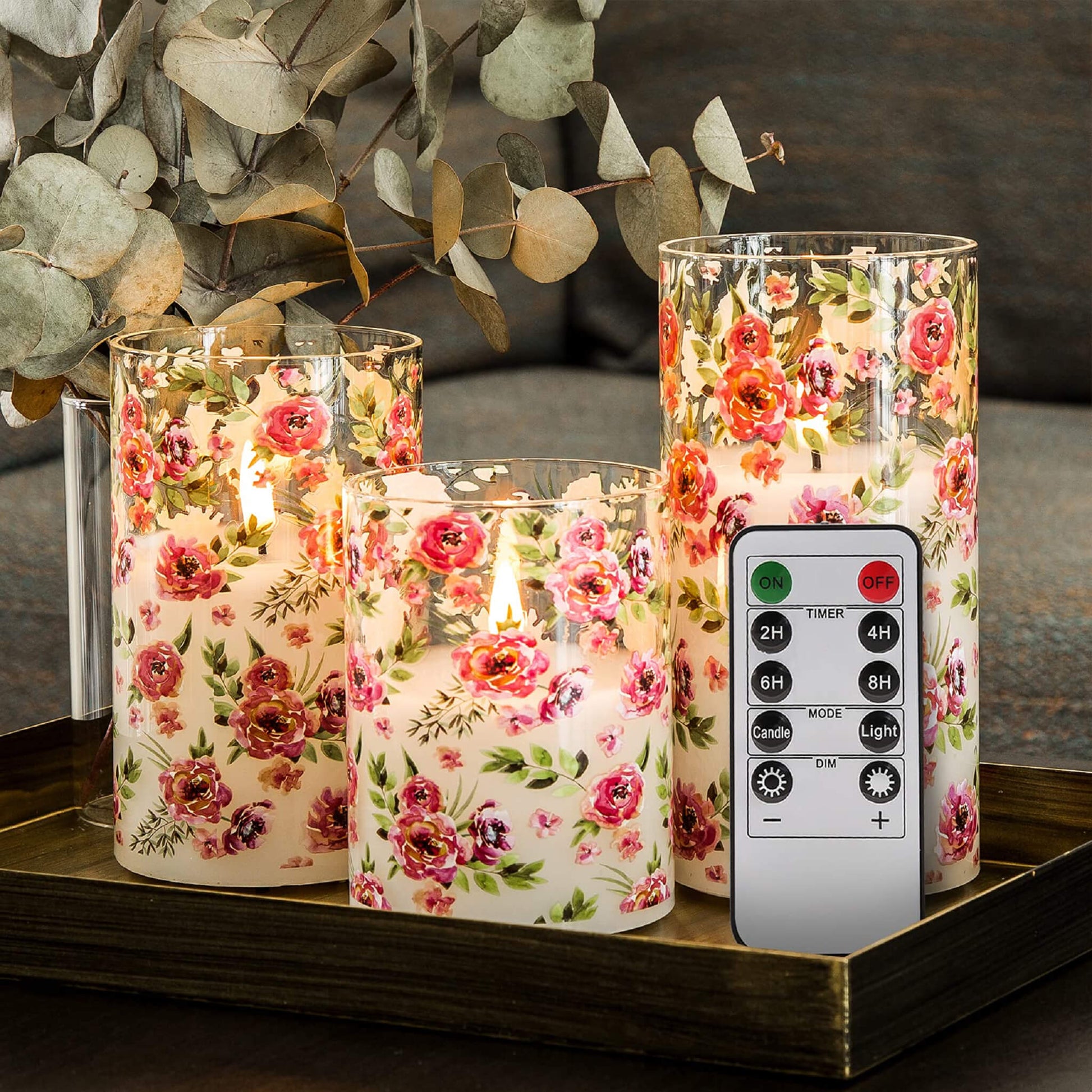 Eywamage Rose Floral Glass Velas sin llama con control remoto