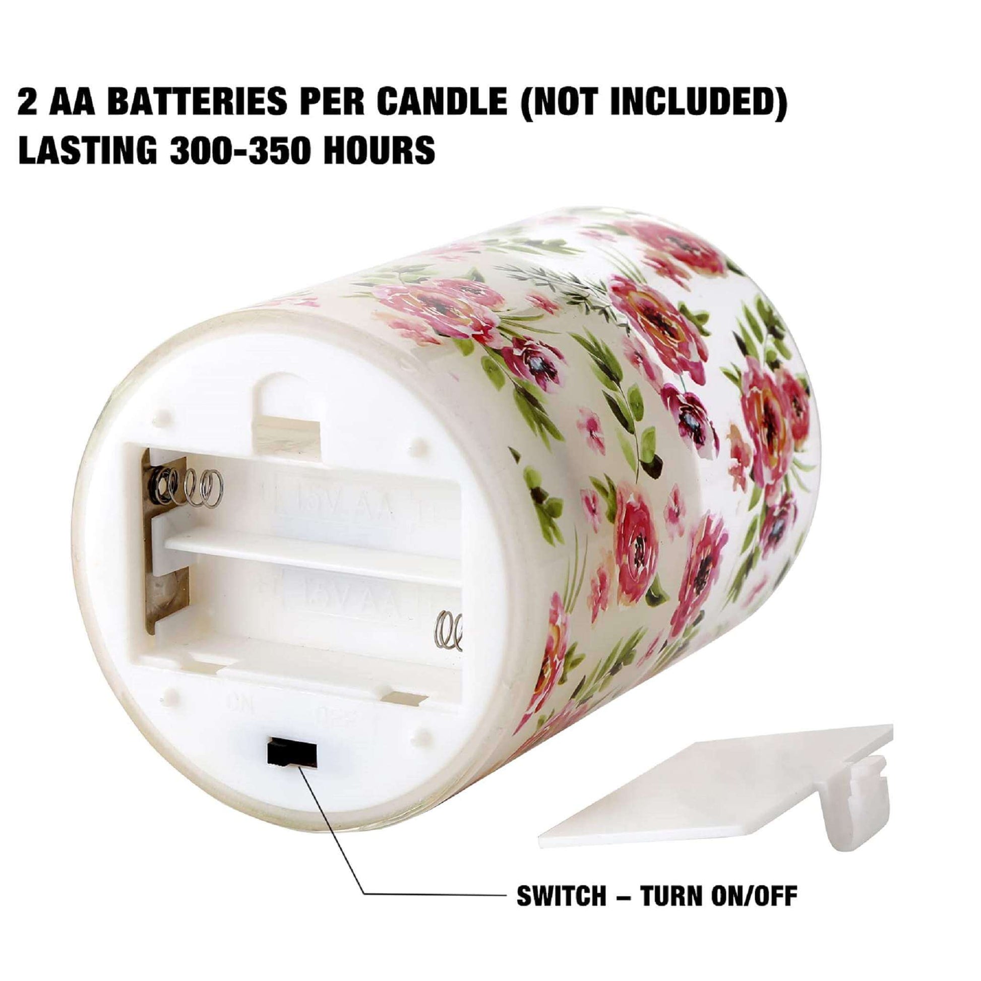 - LISTA DEL PAQUETE: 3 piezas de velas florales rosas sin llama en vidrio (velas de pilar LED) (tamaño: Φ 3" x H 4"/5"/6"), 1 control remoto de 10 teclas, 1 manual de usuario. Las pilas AA NO están incluidas.