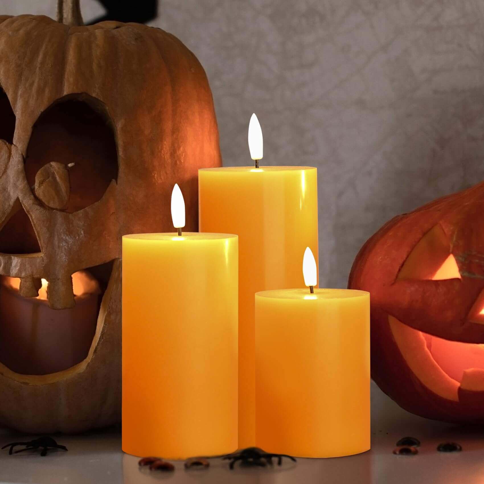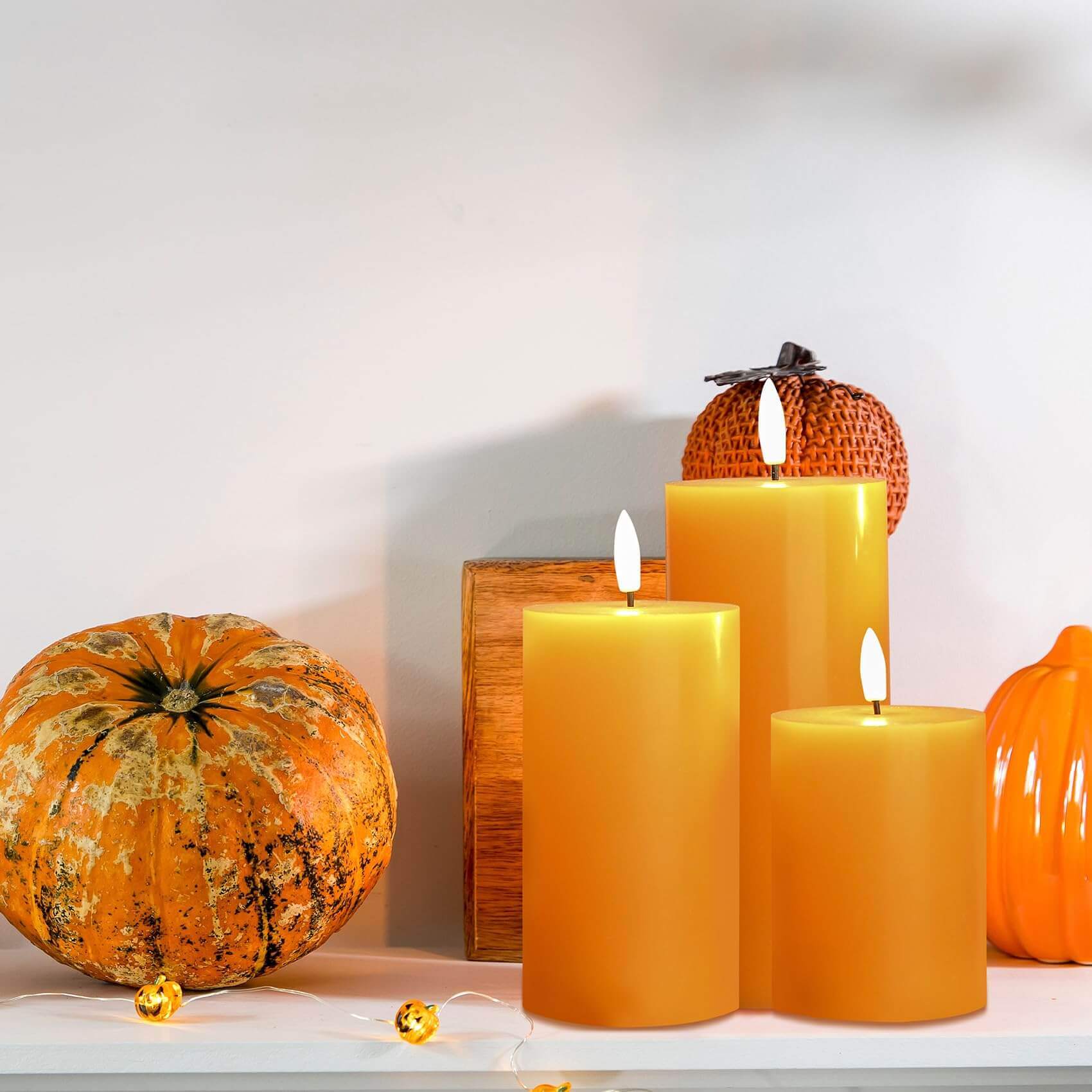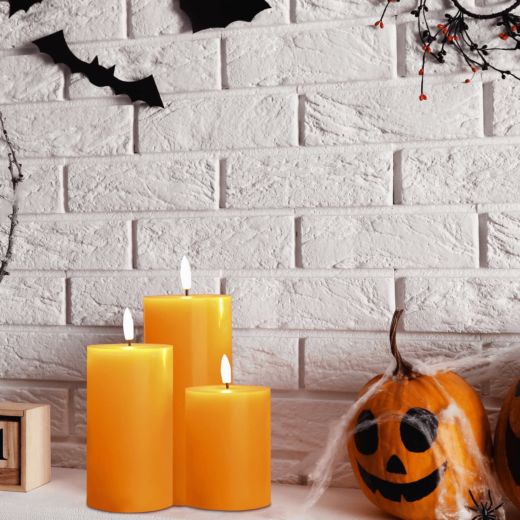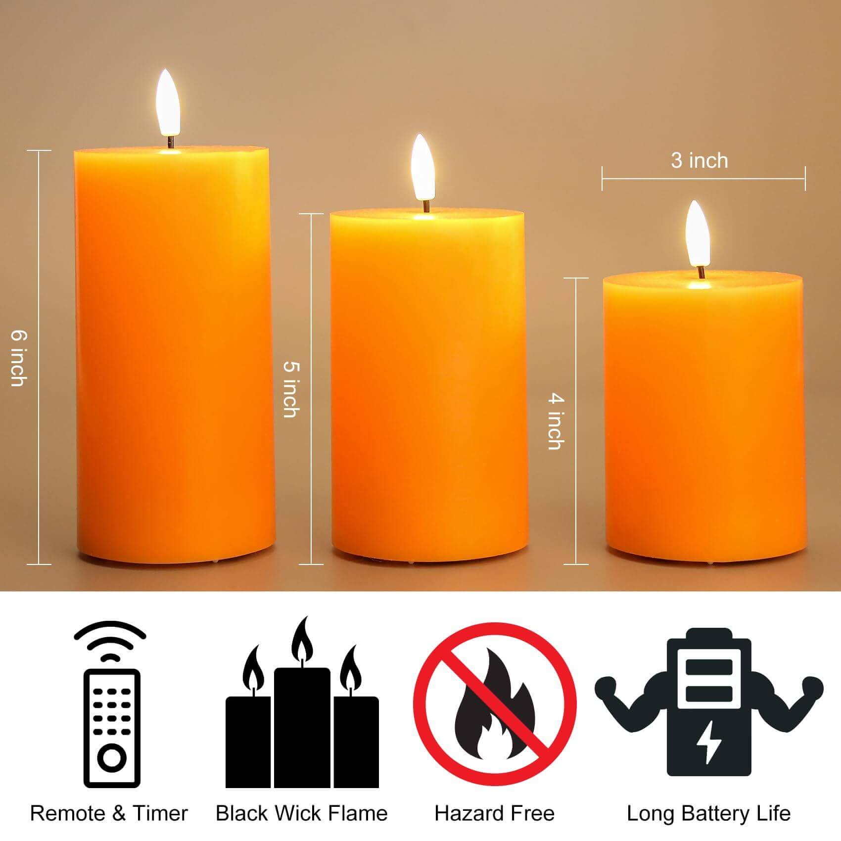 Great Decorations & Gifts - package includes 3 pieces orange battery pillar candles assorted size, great decoration for wedding, party, Halloween, Thanksgiving, home and ideal as gift for housewarming, birthday, seasonal holiday festival and so on.
