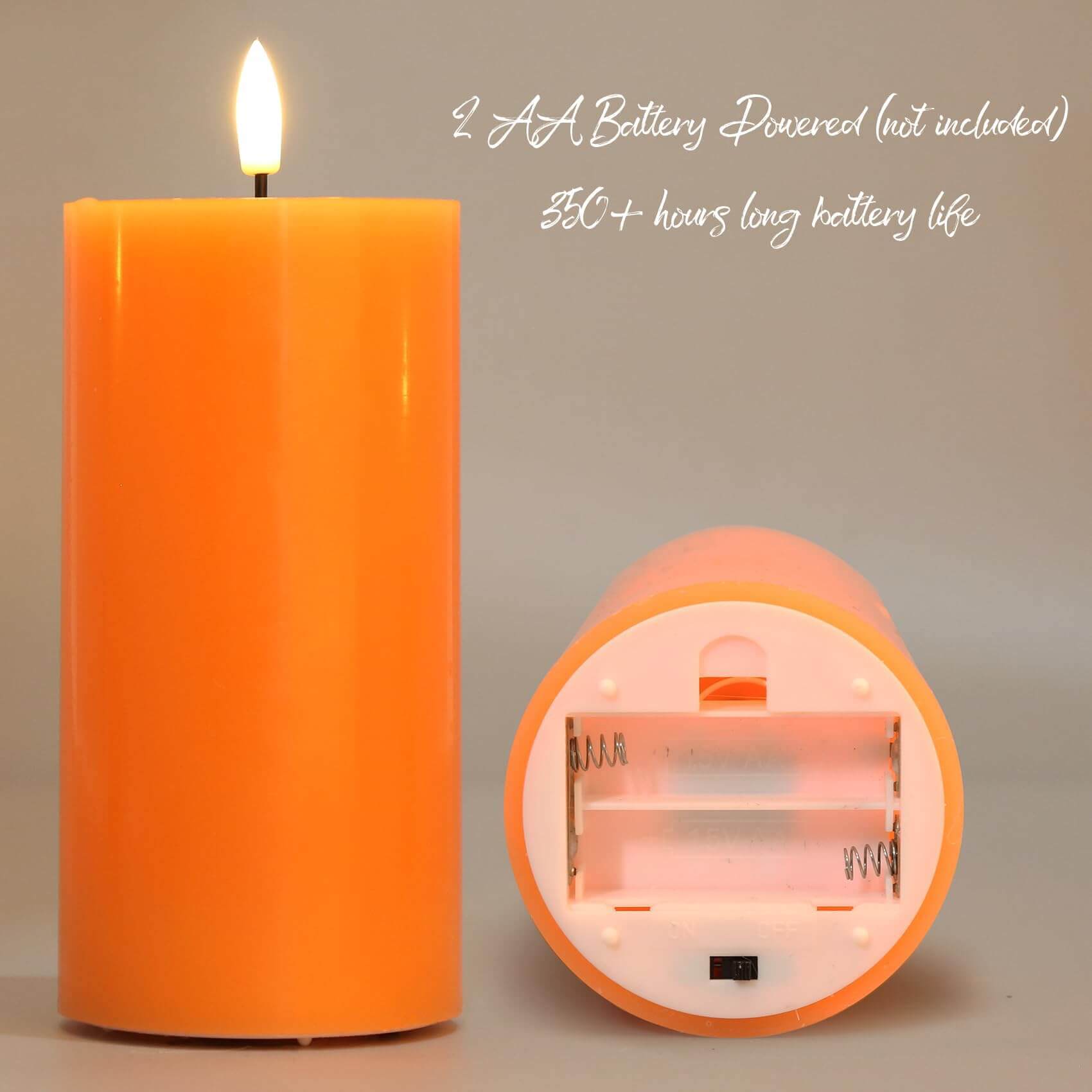 Battery Operated Candles - each candle is powered by 2 AA batteries (not included), lasting over 350 hours, longer battery life.
