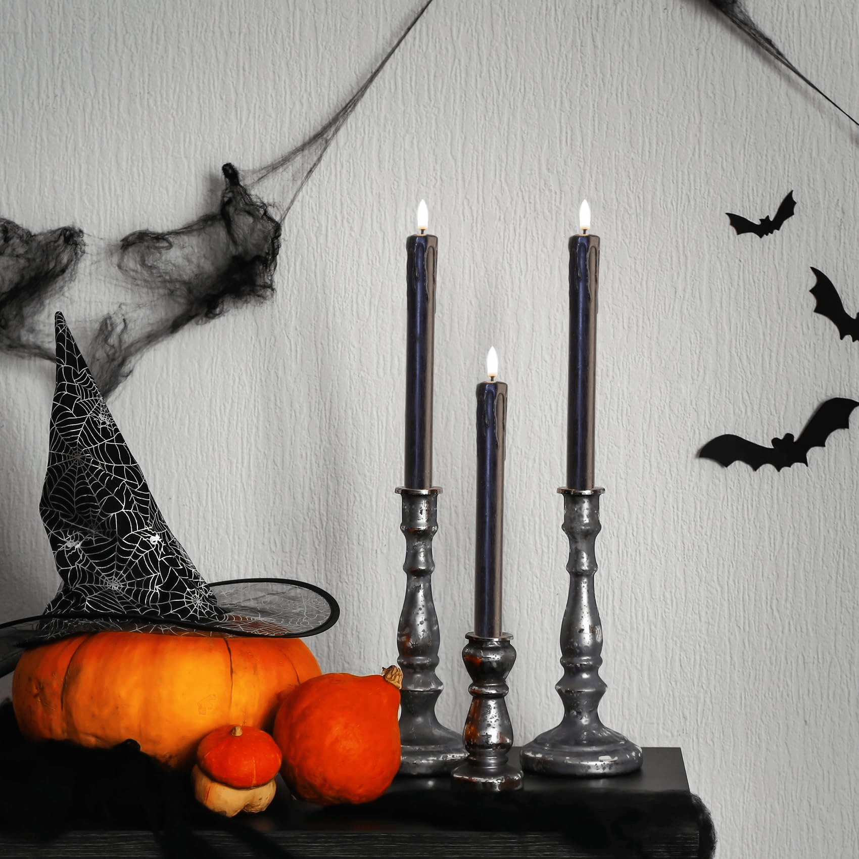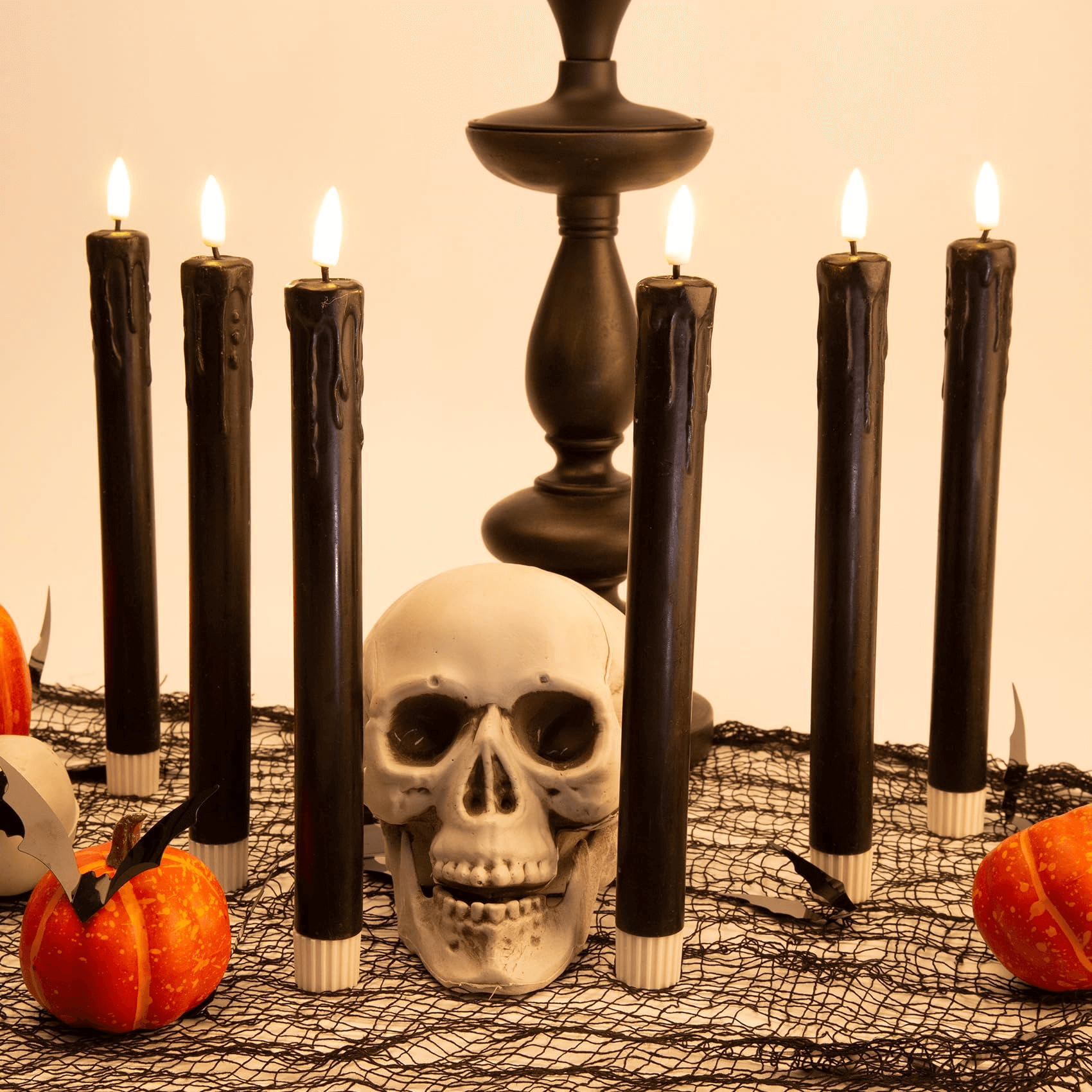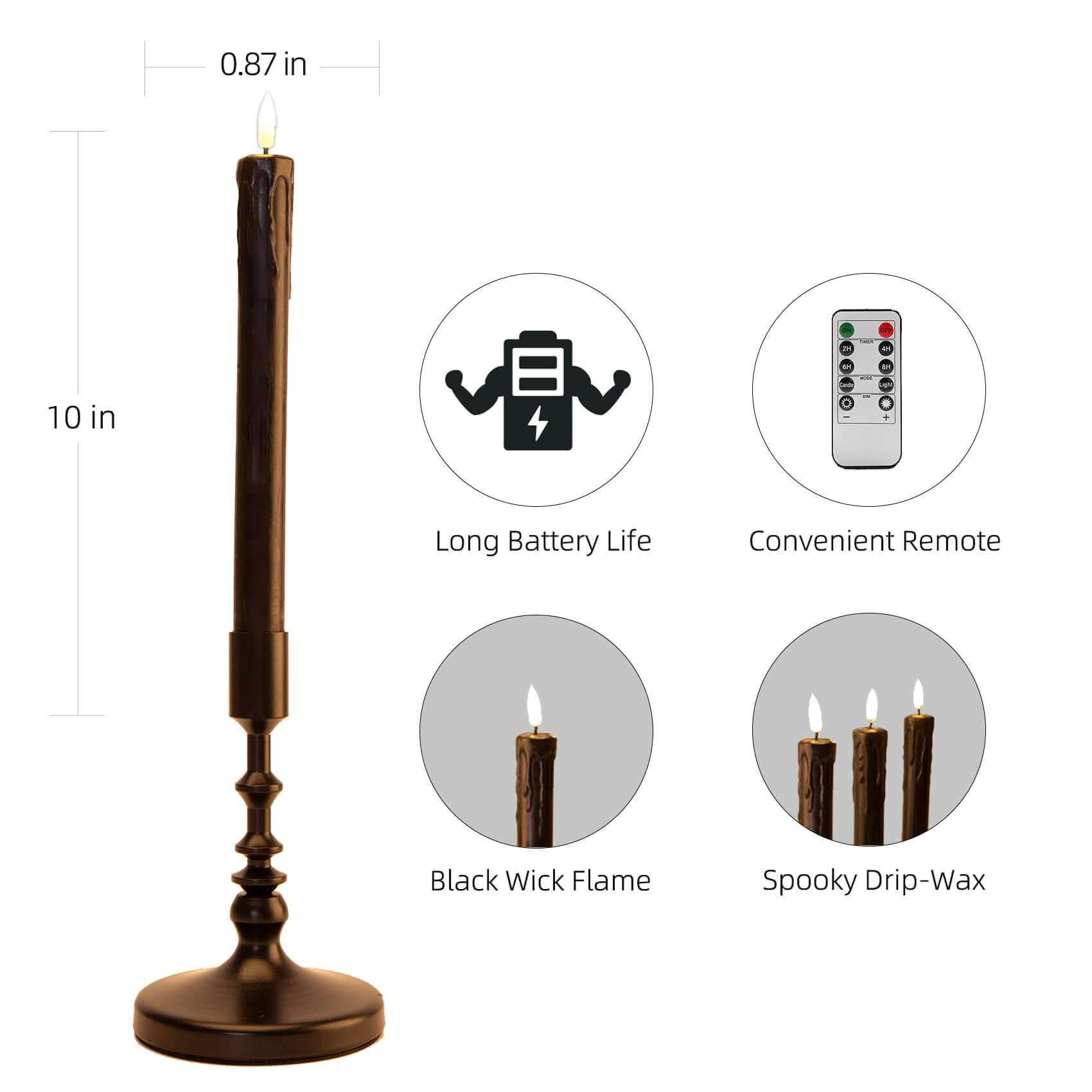 Great Decor & Gifts - package includes 6 pieces black drip-wax flameless taper candles, multi-timer remote controller, button cell battery for remote and user manual, great for Halloween, home, theme wedding party decoration and also wonderful as gift.