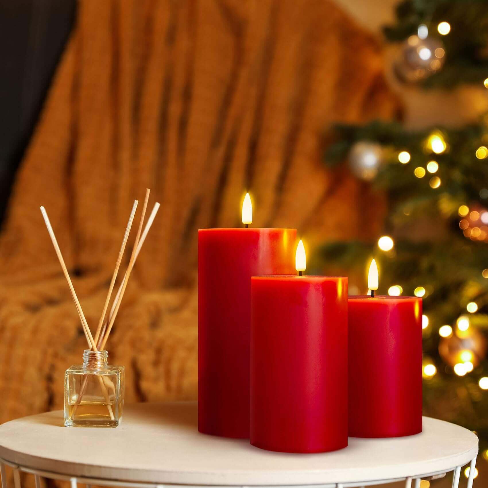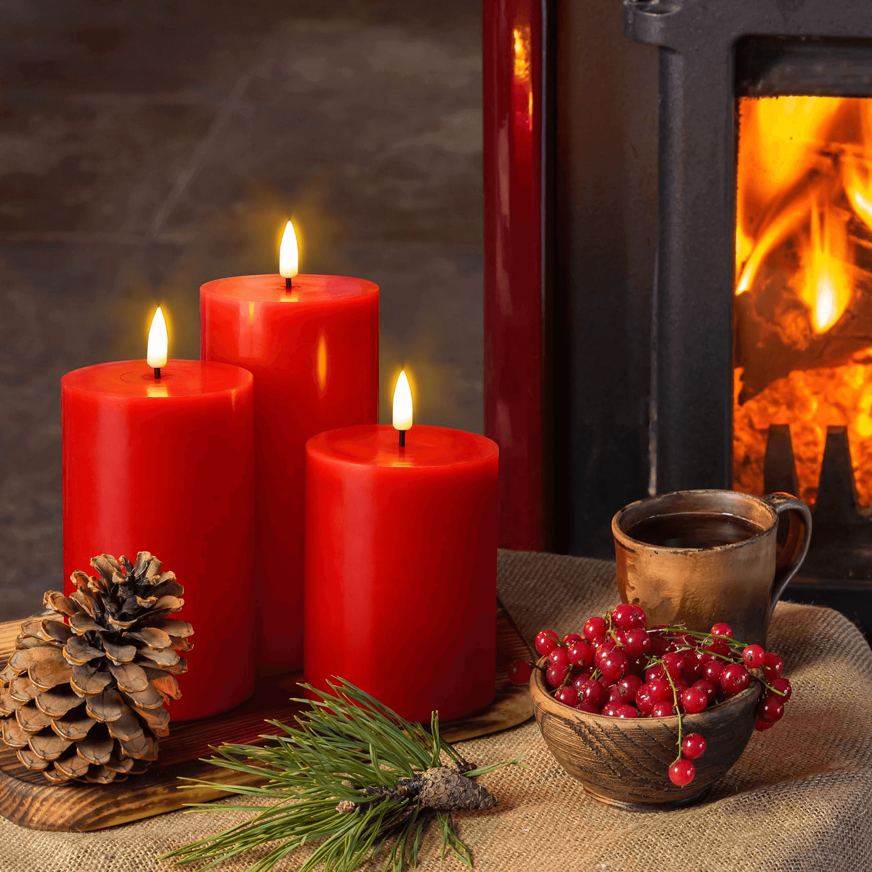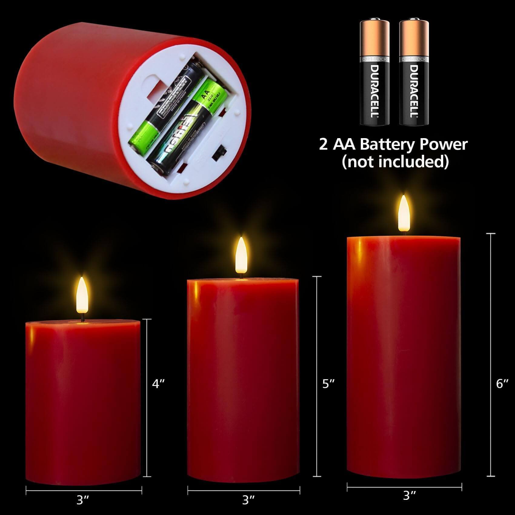 Great Decorations & Gifts - package includes 3 pieces red battery pillar candles, great decoration for wedding, party, Christmas, home and ideal as gift for housewarming, birthday, seasonal holiday festival and so on.